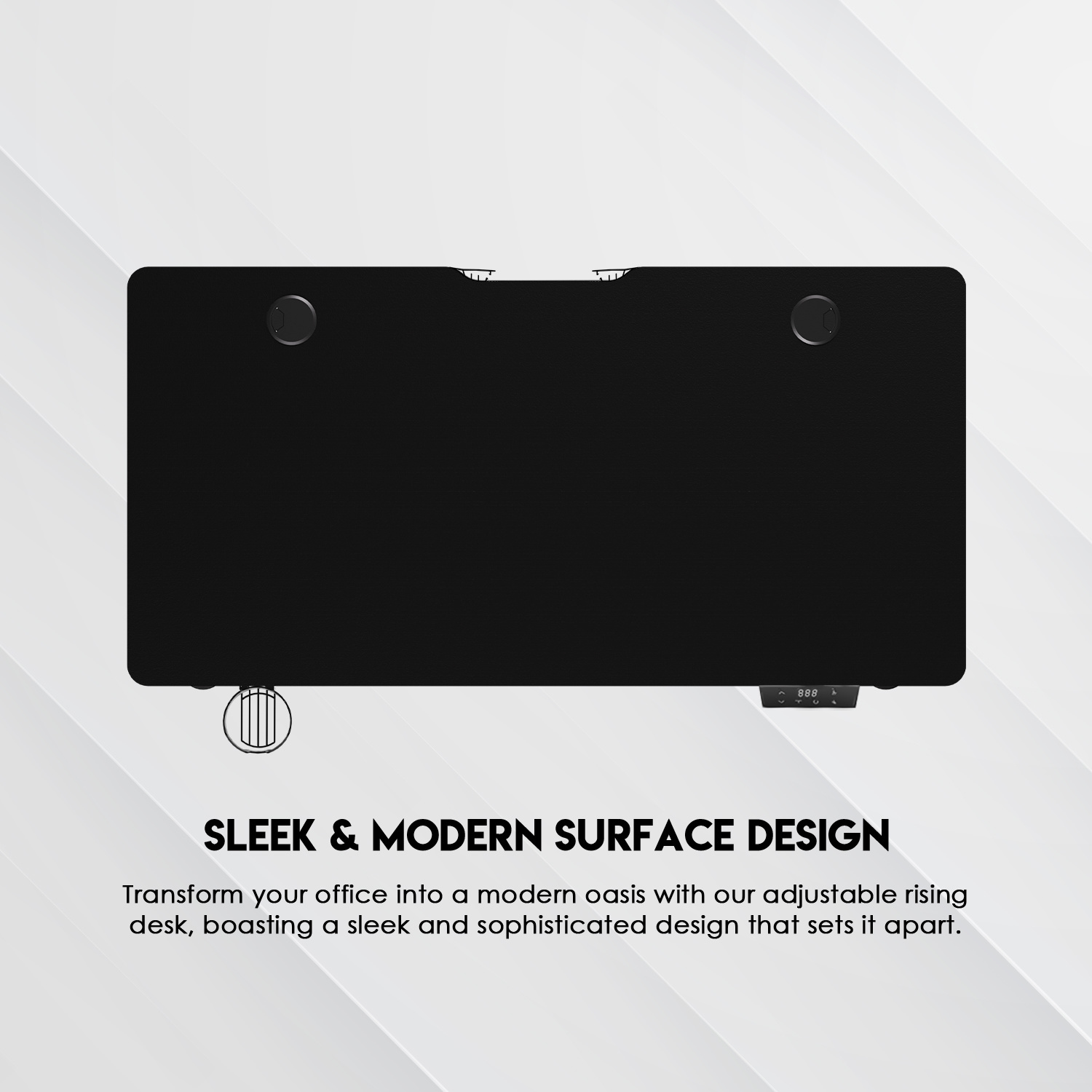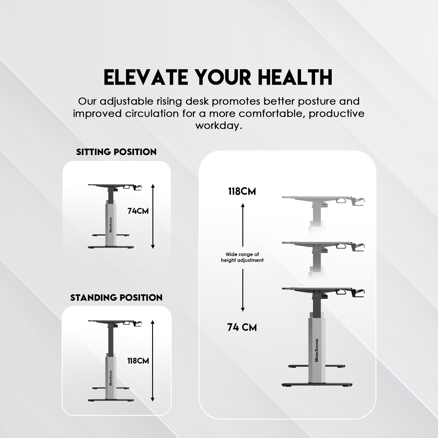 Cuenta con un sistema de elevación eléctrica ajustable, permitiendo cambiar fácilmente entre posiciones sentado y de pie, mejorando la postura, circulación y productividad durante largas jornadas. Su rango de altura va aproximadamente desde 74 cm hasta 118 cm, adaptándose a distintos usuarios