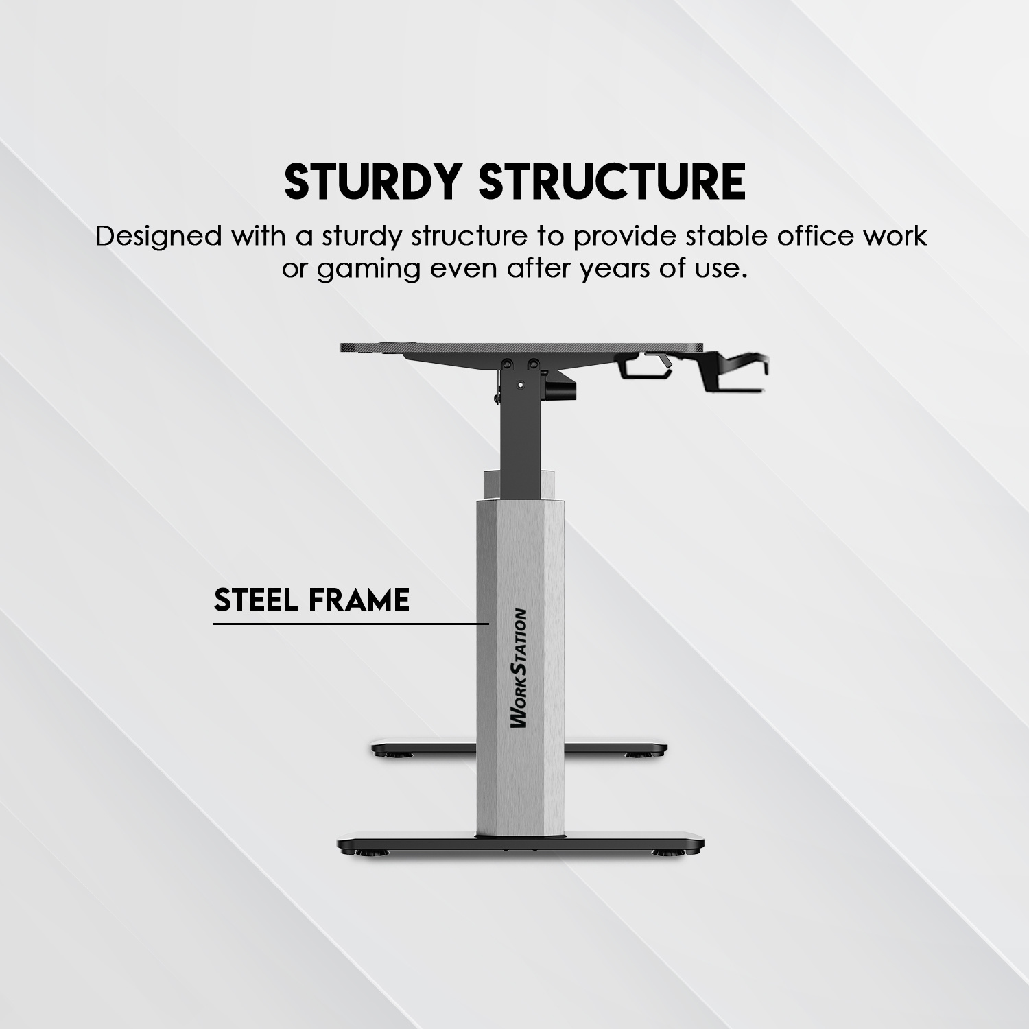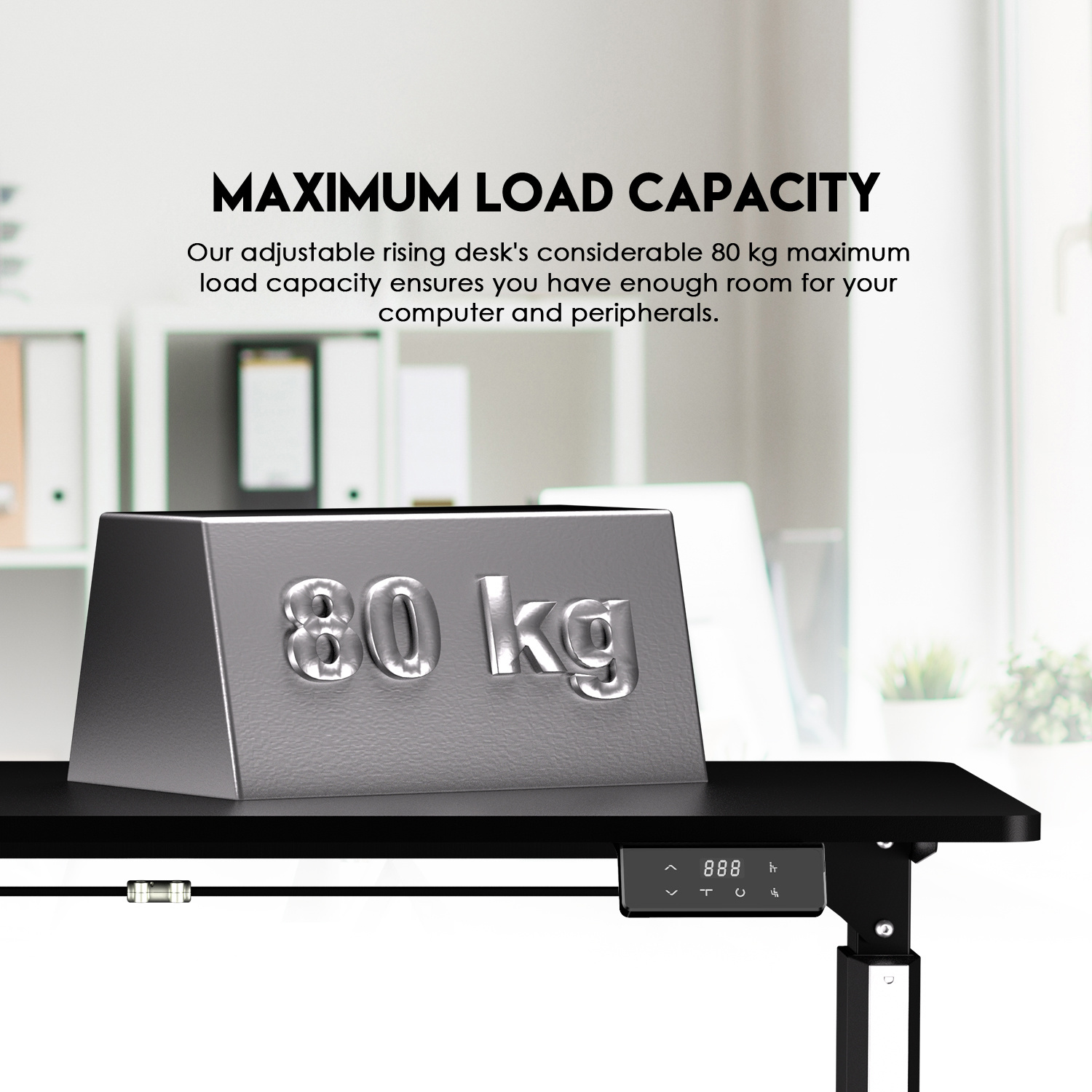 Su amplia superficie de 140 × 70 cm ofrece espacio suficiente para múltiples monitores, periféricos y accesorios, mientras que su estructura sólida soporta hasta 80 kg de carga, asegurando estabilidad total incluso en configuraciones exigentes