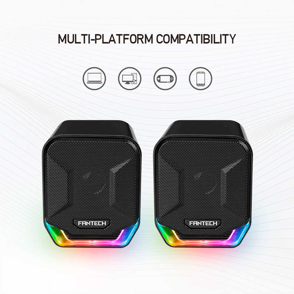 Los Fantech GS202 SONAR RGB son un set de parlantes estéreo 2.0 (dos unidades) pensados para mejorar el audio en PC, notebooks y otros dispositivos, manteniendo un formato compacto ideal para escritorio. Entregan un sonido claro para juegos, música y videos, con iluminación RGB tipo arcoíris que aporta estilo al setup.