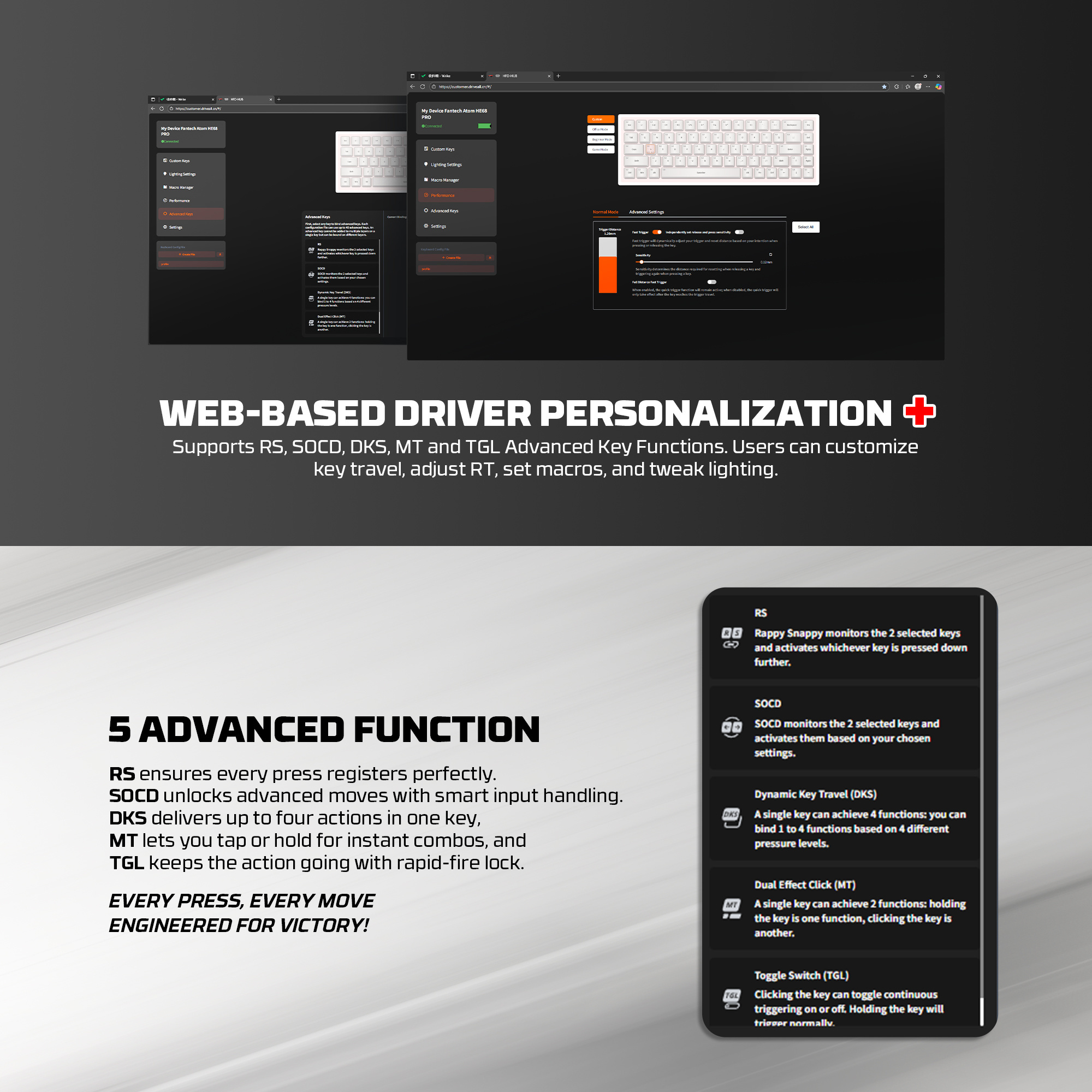Gracias a su tecnología magnética, este teclado permite ajustar el punto de activación de cada tecla, logrando una respuesta más rápida y precisa que los switches mecánicos tradicionales. Además, incorpora polling rate de hasta 8000 Hz (8K) en modo cableado, reduciendo la latencia al mínimo para gaming competitivo.